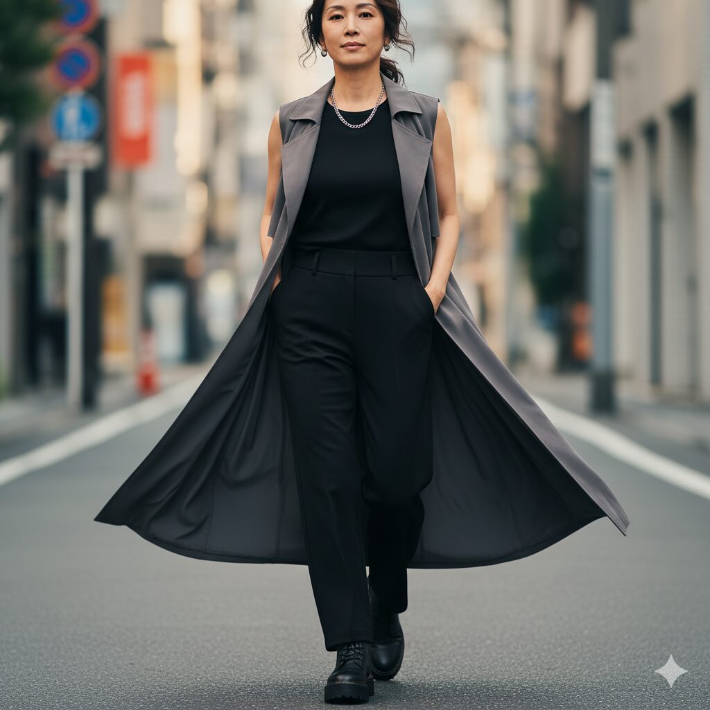 ロングカーディガンやジレを羽織るだけで、体の両サイドが削ぎ落とされ、視覚的に3kgは痩せて見えます。これは錯覚を利用した賢いテクニックです。