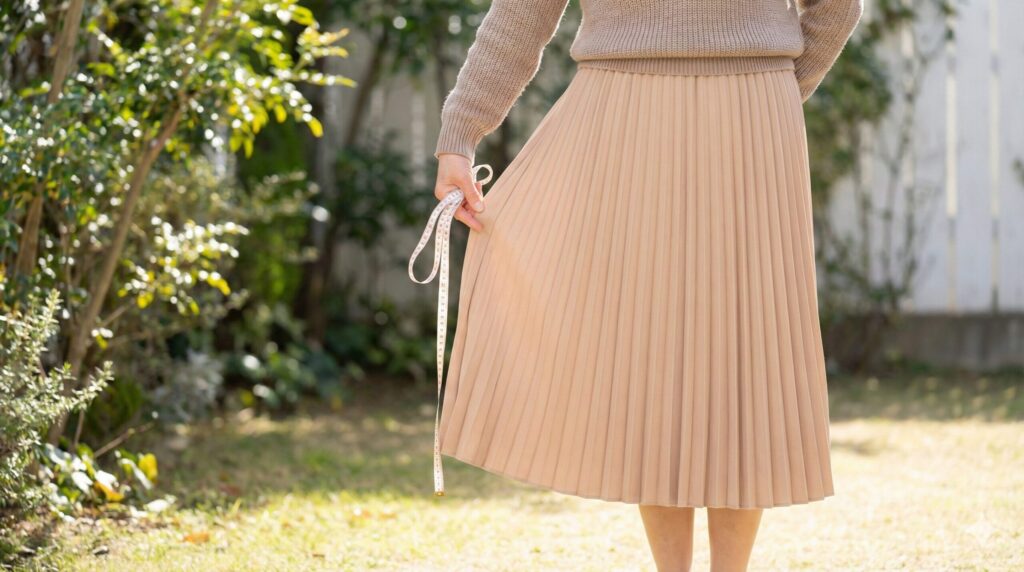 次は、着るだけで勝手にスタイルアップしてくれる魔法のアイテム、「プリーツスカート」です。でも、注意してください。普通のプリーツだと、広がりすぎて「袴(はかま)」みたいになりがちですよね。