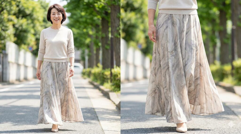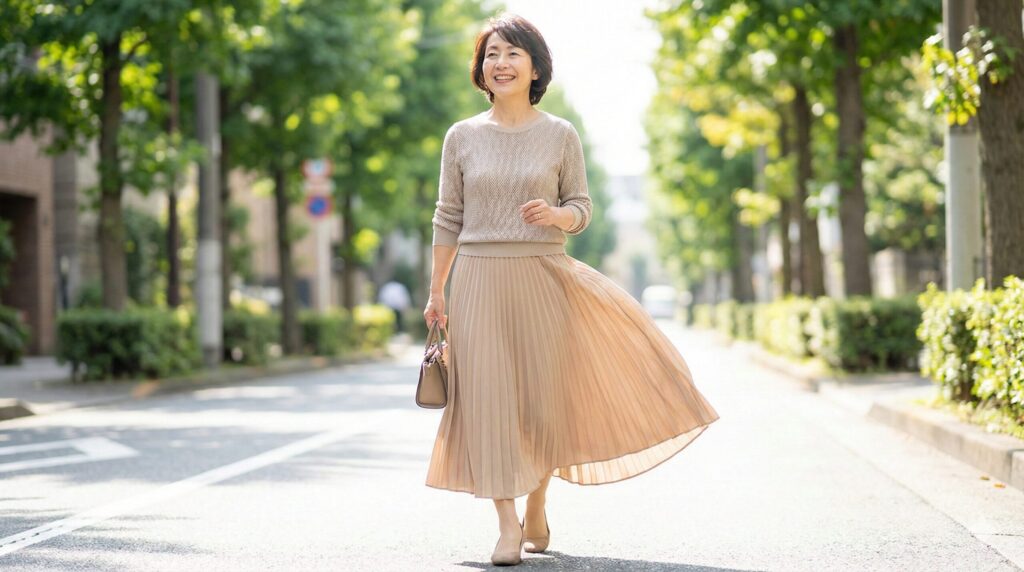 ここで選ぶべきは、「広がりを抑えた落ち感素材」かつ「ジャスト74cm丈」のもの。プリーツそのものが強制的に「縦のライン(Iライン)」を作ってくれるので、150cmの身長がスッと高く見えます。階段を降りるとき、裾がサラサラと揺れる様子は、まさに「優美」そのもの。娘さんやお孫さんからも「今日のお母さん、なんか素敵!」って褒められちゃうかも♪