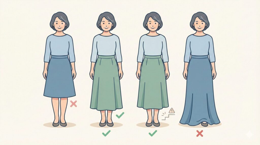 「あちゃー、あのタンスの肥やしになってるスカート、62cmだったわ……」なんて思い当たる節、ありませんか?特に60cm前後は、ふくらはぎが強調されるだけでなく、中途半端な長さが「子供っぽさ」を助長してしまうので、大人の女性は避けるのが無難ですね。