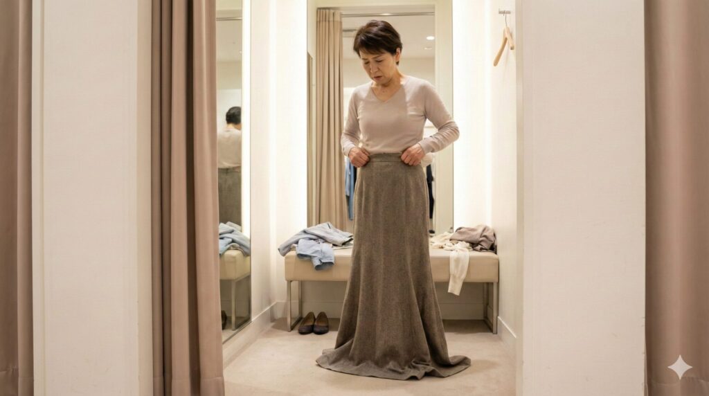 こんなふうに鏡の前でガッカリして、そっと商品を棚に戻した経験、ありませんか? でも、声を大にして言わせてください。それは決して、あなたのスタイルが悪いわけでも、年齢のせいでもありません。