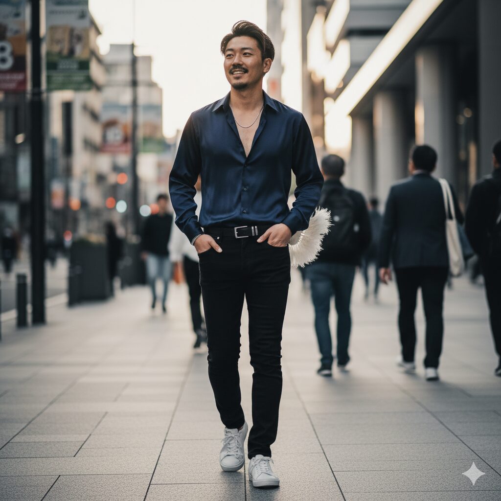 主役である光沢シャツだけを80年代風にし、他のアイテムは現代のベーシックなもので固めます。- 例:黒いサテンシャツ × 現代的な細身の黒スキニーパンツ × 白スニーカー。