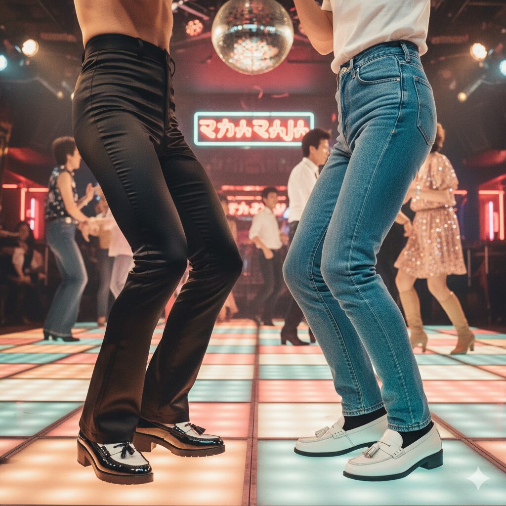 | 光沢(テカリ) | サテンやシルク素材。ディスコの照明を反射し、ステージ上の主役のように輝く効果を演出します。 | バブル景気と相まって、「リッチさ」や「華やかさ」を強調しました。 |
