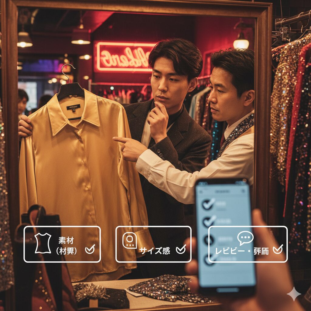 さあ、着こなしのイメージが固まったら、次はいよいよアイテムの「狩り」に出発です! 「あの光沢シャツはどこで売ってるの?」「ネットで買ったら、写真と全然違ったらどうしよう…」と、購入前の不安は尽きませんよね。特にコスチューム系アイテムは、素材感が命なので失敗したくありません。