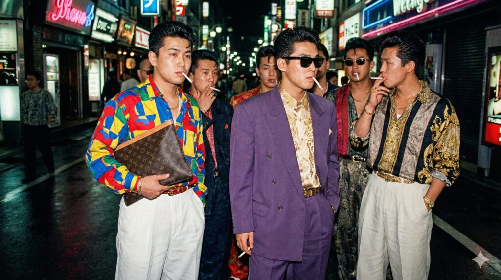後の「Vシネマ」系のファッションにつながる、いかついスタイルの原点です。成人式で紫色のダブルスーツを着ていた友人、一人はいたはずです(笑)