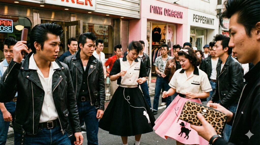 音楽を通じて広まったロカビリーの反骨精神とスタイルが、地方の若者にとって「東京のかっこいい不良」を真似るための教科書になりました。革ジャンを羽織ることは、ただ寒さをしのぐだけでなく、ロックンロールの魂を身にまとうような行為だったのです。