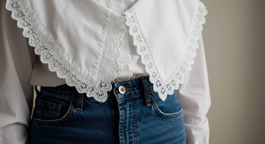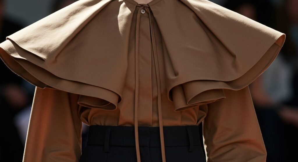 - 大きなフリル襟のブラウスとシンプルなボトムスの組み合わせ