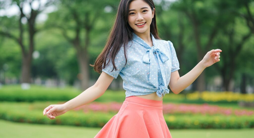 アクティブキュートさんの最大の魅力の一つは「大きな目元」と「目力」ですよね 。トップスで丸みのある襟元や華やかな装飾を取り入れると、自然と視線が顔周りに集まって、その印象的な目元がさらに際立つ効果があるんです 。これは、顔立ちの強さに合わせて服も「主張」することで、全体のバランスを取るという、まさに黄金律なんです。あなたの目力を最大限に強調し、より魅力的な印象を作り出すために、ぜひトップス選びで遊んでみてくださいね!