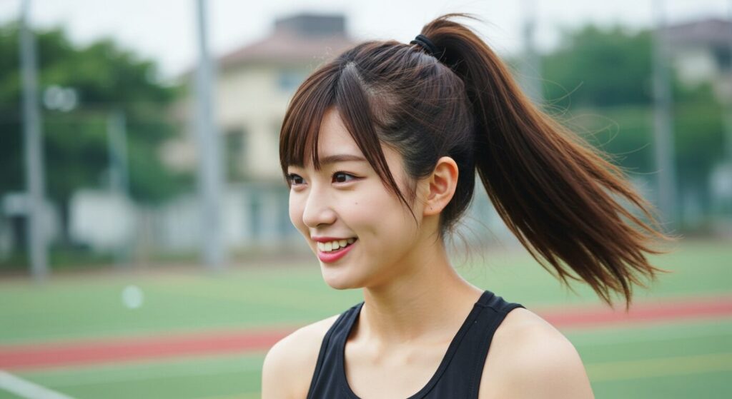 - ハイポニーテールでアクティブさを強調したアレンジ