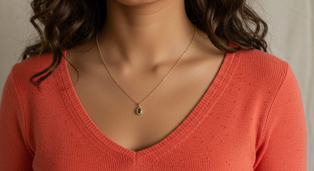 - Uネックの鮮やかカラーニットにネックレスをプラスしたスタイル