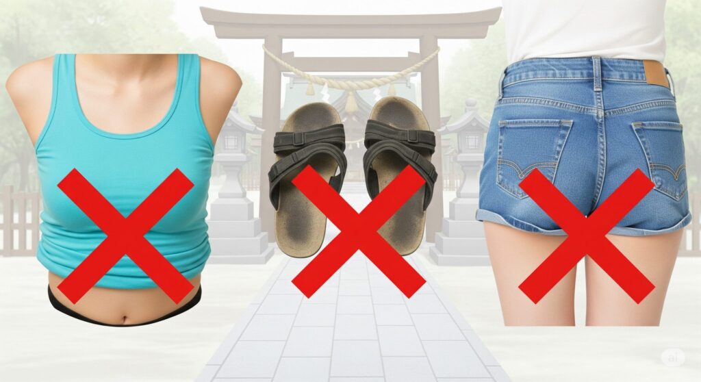 さて、ここまで「熱田神宮は比較的柔軟」というお話をしてきましたが、何事にも「これはちょっと…」というNGなラインは存在します。このセクションでは、男性も女性も共通で注意すべき、絶対に避けるべき服装とマナーについて解説します。