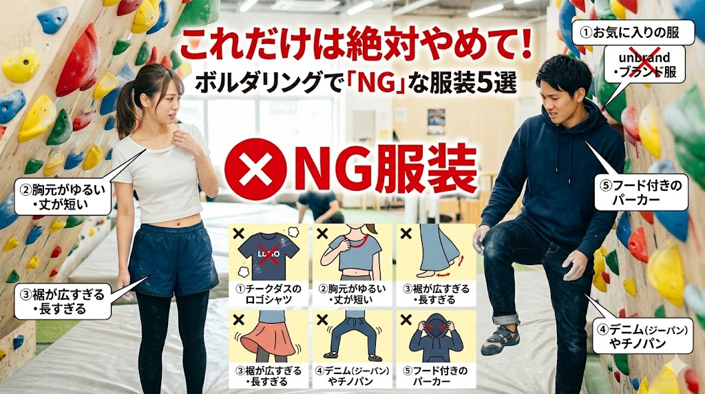 しかし、「家にある適当なTシャツとジーパンでいいや」と油断するのは絶対にやめてください。 ボルダリングには、登りにくいだけでなく、まわりに下着が見えてしまったり、大怪我につながったりする「NGな服装」が明確に存在します。