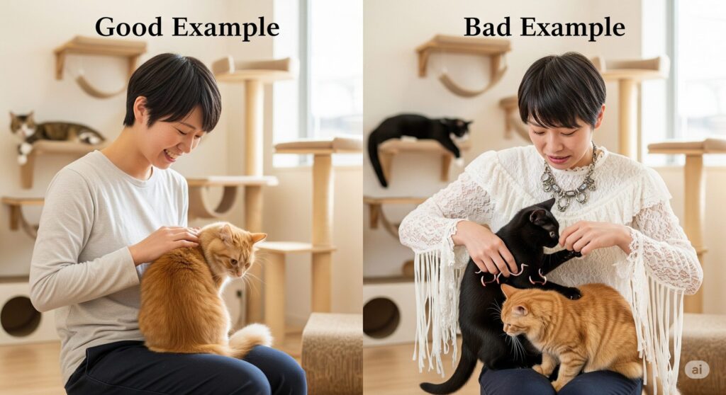 動きやすい服装は、猫との触れ合いという体験を最大限に楽しむための前提条件です 。 - 安全性: