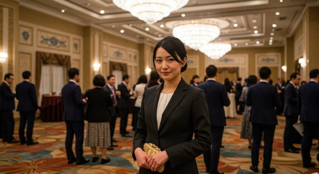 男性編に続いて、ここでは女性の皆さんがホテル懇親会で「品格」と「垢抜け感」を両立させるための、とっておきコーデを5つご紹介しますね!「男性はスーツでOKって分かりやすいけど、女性は選択肢が多すぎて逆に悩む…」そんな風に感じている方も多いのではないでしょうか?