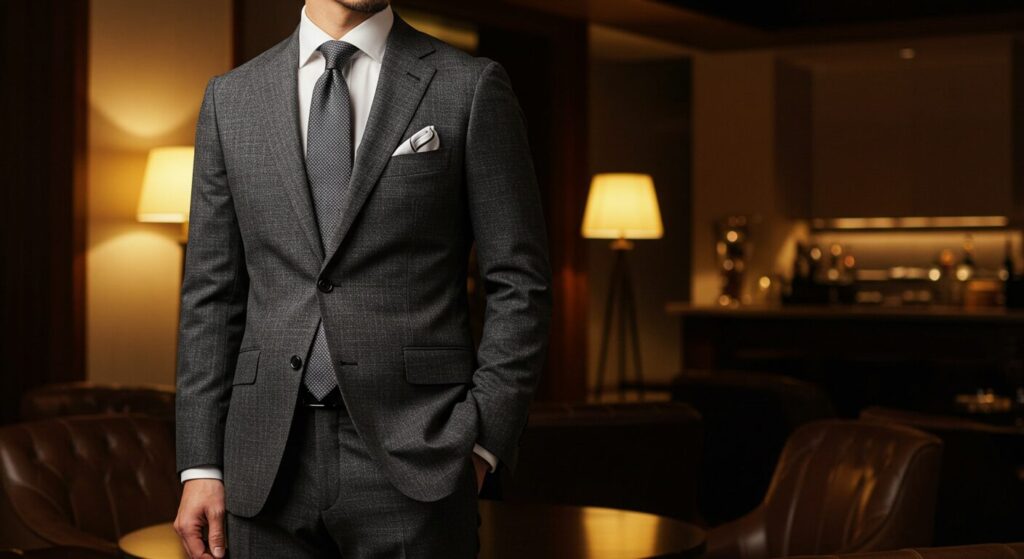 まず、どんなホテル懇親会でも通用する、まさに「鉄板」中の鉄板が、このベーシックなビジネススーツスタイルです 。黒、ネイビー、グレーといったダークカラーの無地スーツは、信頼感を与える基本的な服飾であり、正式な席でまず間違いがありません 。まるでビジネスシーンの「白ご飯」のような存在で、どんなおかずにも合う万能選手なんです。