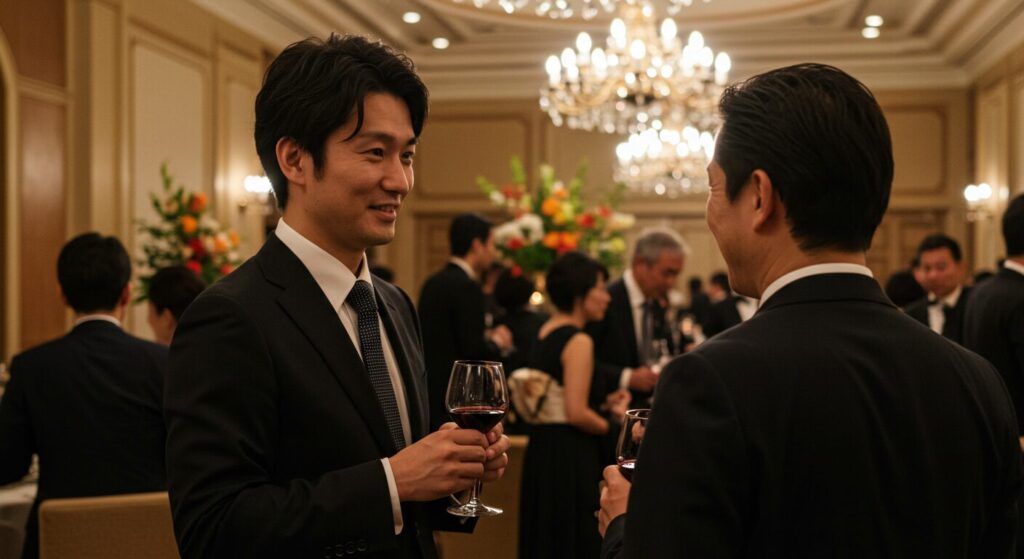さて、ここからは、まさに「勝負服」とも呼べる、最高峰のスタイルをご紹介します。もし、あなたのホテル懇親会が、単なる親睦会ではなく、「式典後のパーティー」や「取引先の記念行事」、「表彰式後のレセプション」といった、より華やかで格式高い場面であるなら、この「ドレッシーなパーティースーツ」スタイルが断然おすすめです。