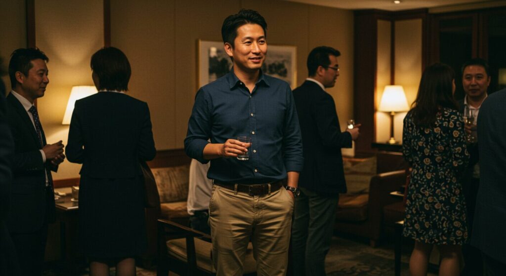 居酒屋やカフェなど比較的カジュアルな会場はもちろん、ホテル内のカジュアルダイニングでの懇親会にも対応できる、まさに「使える」スタイルです。きちんとした印象は保ちつつ、堅苦しすぎないバランスがポイント。ぜひ、このスタイルをマスターして、スマートな大人の魅力を振りまいてみてくださいね!