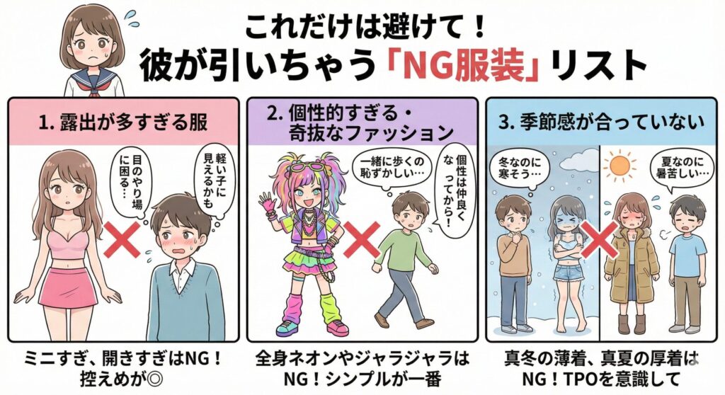 • 「目のやり場に困る」「軽い子に見える」と男子には不評です。ミニスカートすぎる丈や、胸元が開きすぎた服は避けましょう。