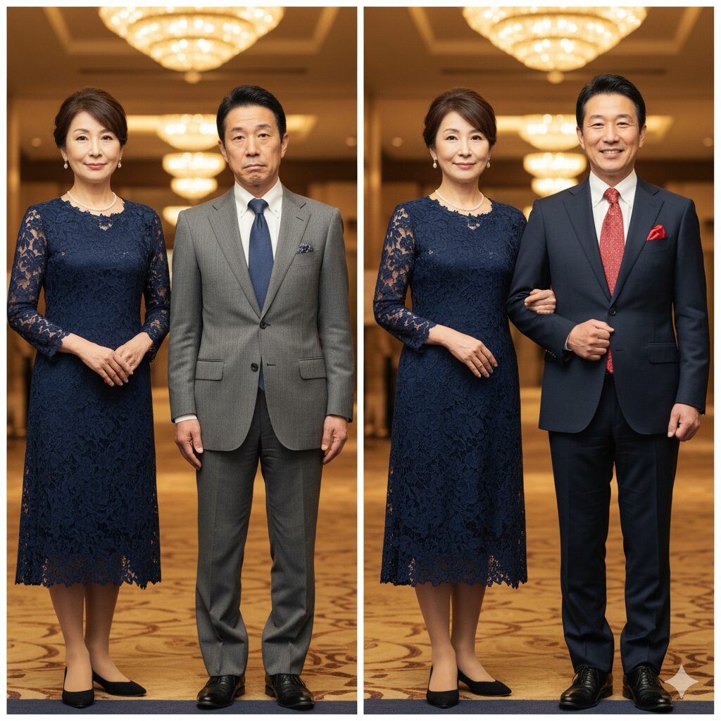 いくらあなたが完璧でも、二人のバランスがチグハグだと、周りからは「あれ、奥様だけ張り切ってる?」なんて見られかねません。そうならないために、お互いの「格(フォーマル度)」をピタリと合わせるコツをお伝えしますね♪