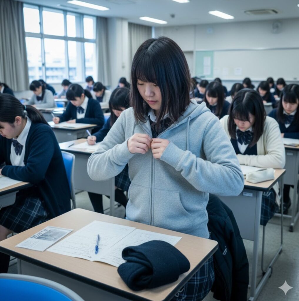 | 不安3: 脱ぎ着がしにくいデザインだと困るか? | ジッパー付きやボタンで開閉できるタイプが最適解です! | 試験会場の室温は、真冬でも暖房が効きすぎたり、逆に寒かったりして予測不能です。脱ぎ着がスムーズにできないと、試験中に体温調節のチャンスを失い、集中力が切れることになります。快適性を考えた実用的な選択をしてくださいね。 |