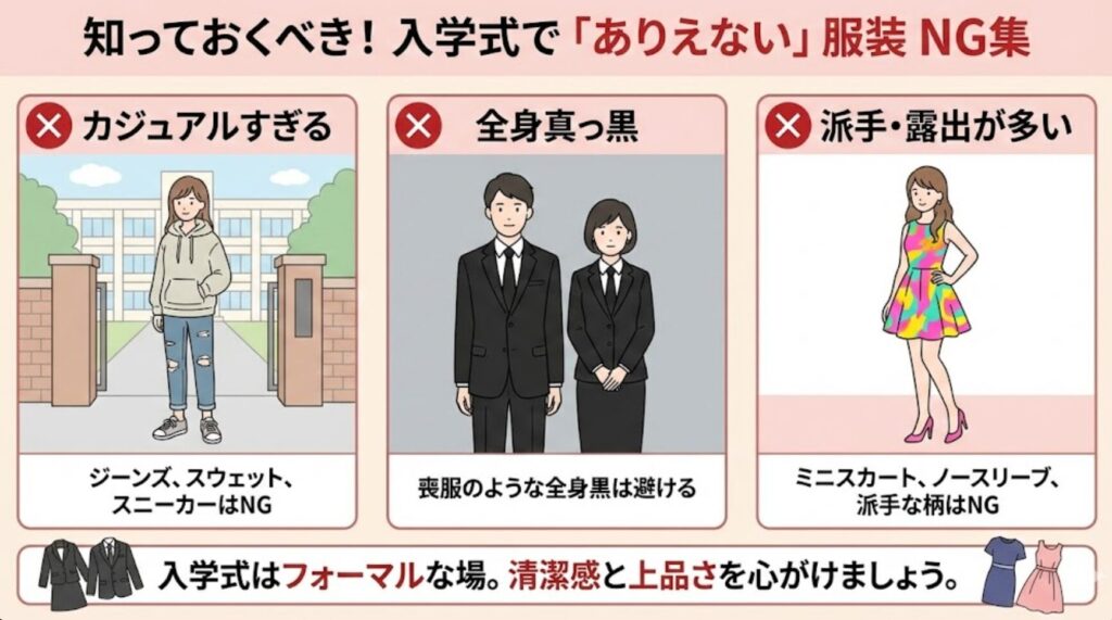 入学式は、セミフォーマルな装いが基本です。主役はお子様ですので、保護者の方は控えめでありながらも、きちんと感と清潔感のある服装を心がけましょう。以下に、入学式で避けたい具体的なNG例とその理由をまとめました。