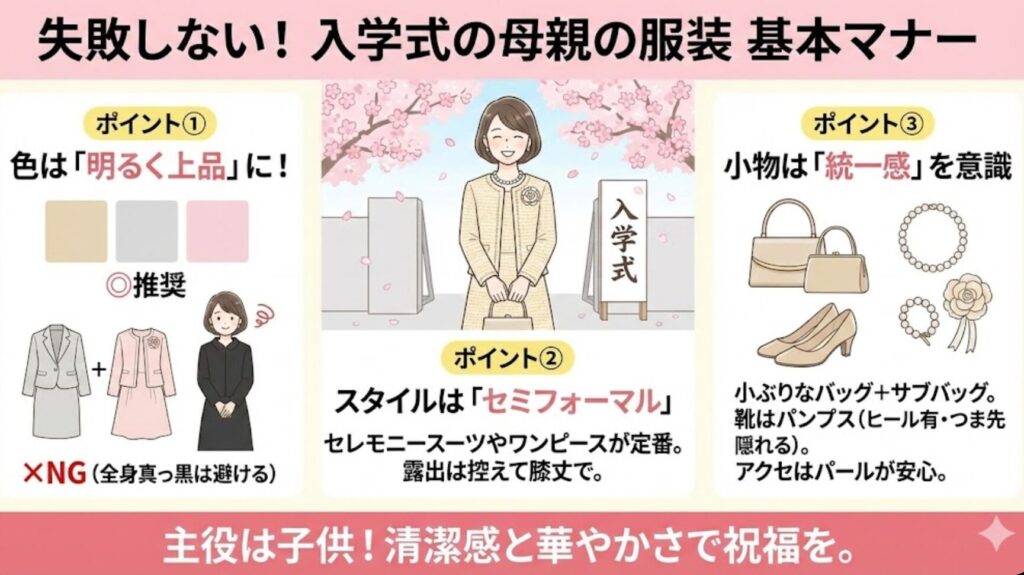 入学式はフォーマルな式典であり、お子様が主役となるお祝いの場です。母親の服装は、清潔感があり、控えめでありながらも上品な装いを心がけることが大切です。悪目立ちするような派手な服装は避け、きちんと感のあるスタイルを意識しましょう。