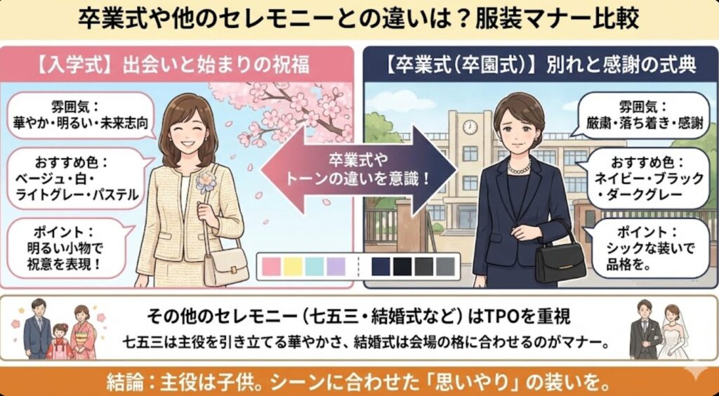 次に気になるのは、卒業式や、入園式、大学の入学式など、他の大切なセレモニーではどのような点に注意すれば良いのか、ということですよね。ここでは、入学式と卒業式、そしてその他の代表的なセレモニーにおける母親の服装の違いについて、詳しく解説していきます。