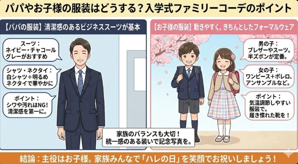 まず、パパの服装についてです。入学式は正式な式典ですので、基本的にはスーツを着用するのがマナーです。黒、ネイビー、グレーなどのダークカラーのスーツは、落ち着いた印象を与え、どのような場にも馴染みます。お子様が主役とはいえ、パパは家族の代表として見られるため、清潔感があり、きちんと見えるように心がけましょう1。