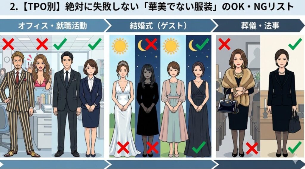 「華美」とは、単にきらびやかなことではありません。「その場の主役(または目的)よりも、自分が目立ってしまうこと」。これがすべての判断基準です。
