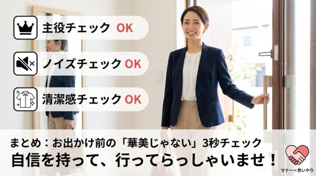 最後に、家を出る前に玄関でできる「3秒チェック」を用意しました。これをクリアしていれば、誰になんと言われようと堂々としていて大丈夫です。