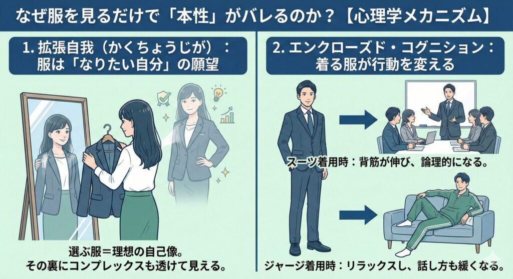 つまり、選んでいる服 = その人が「こう見られたい」という願望そのもの。逆に言えば、その願望の裏にある「コンプレックス(隠したい自分)」まで透けて見えてしまうということですね。