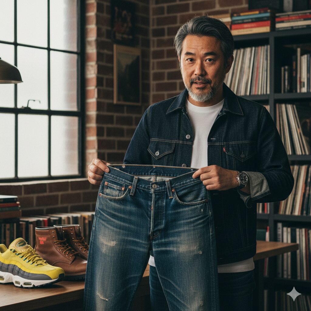 極上の色落ちをしたヴィンテージデニムを、まるでそこらへんの服のように「無造作に、でも品良く」着る姿勢です。つまり、アイテムに込められた価値を誇示するのではなく、「俺はこんな良いものを着ているけど、別に気にしてないぜ?」という粋な余裕を演出することなんです。このギャップこそが、見る人に「誰よりもクールで自然体」という印象を与えていました 。