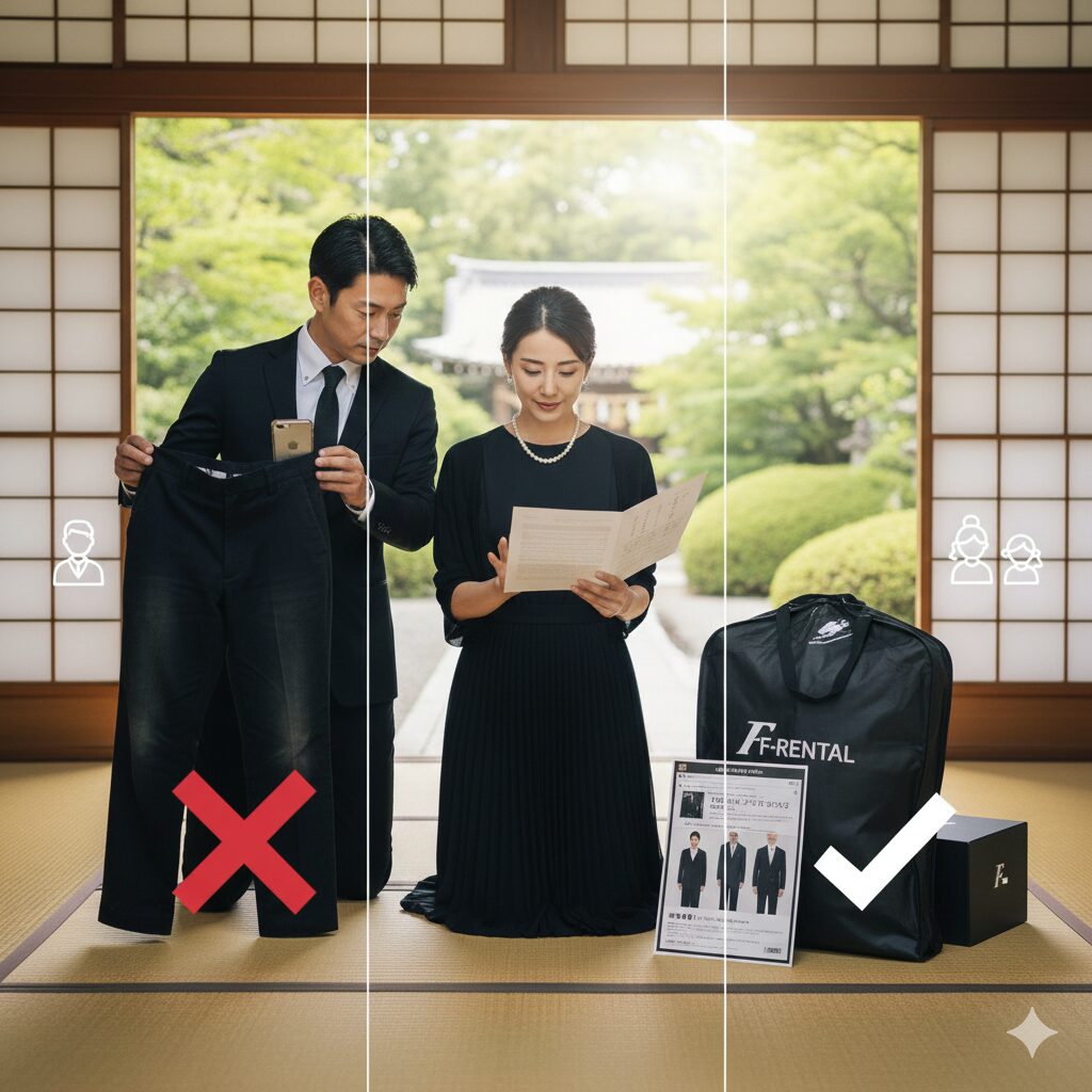 「急な連絡で、ユニクロに買いに行く時間もない!」 そんな究極の「もしも」に直面したら、喪服レンタルサービスを検討するのも賢い選択です。