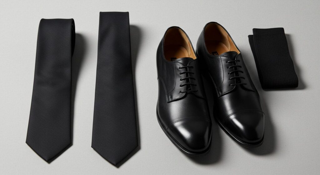 黒無地のネクタイは必須です 。光沢のないシルク素材を選ぶと、一気にフォーマル感が増します。 - 足元は、黒の革靴(プレーントゥダービーシューズなどが良いでしょう )と黒無地の靴下で引き締めてくださいね。スニーカーは避けてください。