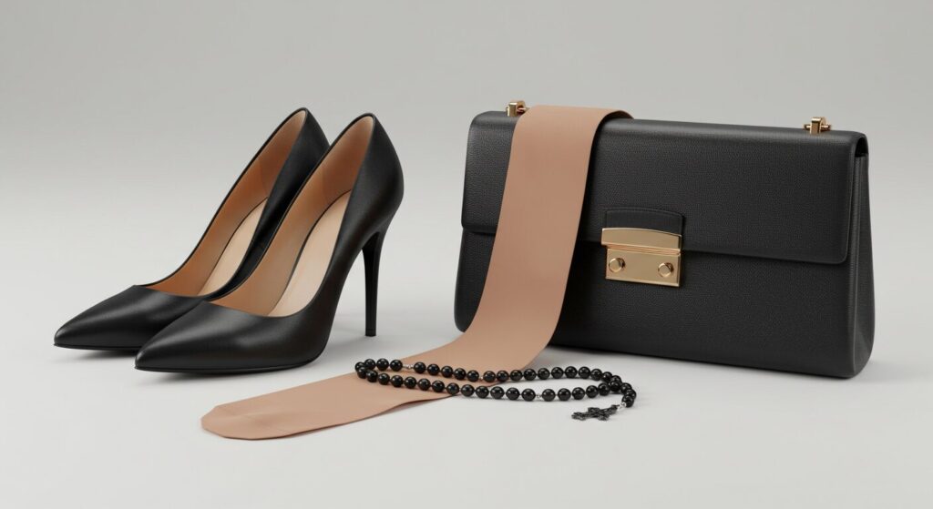 光沢のない布製や革製で、金具が目立たないシンプルなものを選びましょう 。小さめですが、数珠やハンカチなど最低限の荷物が入るものが便利です。 - 黒または肌色のストッキング: