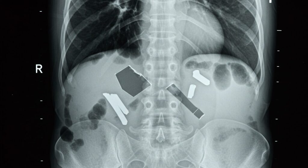 レントゲン検査で最も問題になりやすいのが、金属やプラスチック製の部品です 。想像してみてください。X線は金属にぶつかると、まるで壁にぶつかったかのように跳ね返されてしまいます。その結果、画像には非常に明るい白い影が映り込み 、肝心な体の中が全く見えなくなってしまいます。