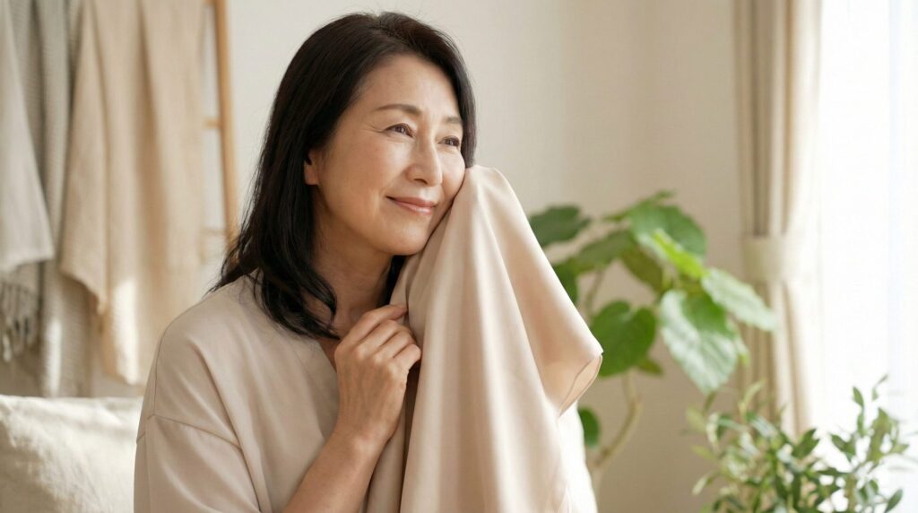 - 枕の高さをチェック高すぎる枕は、寝ている間にずっと首を下に向けている状態(スマホ首と同じ!)を作ります。これこそ、深いシワを刻むプレス機です。低めの枕や、首のカーブに合うものを探してみましょう。