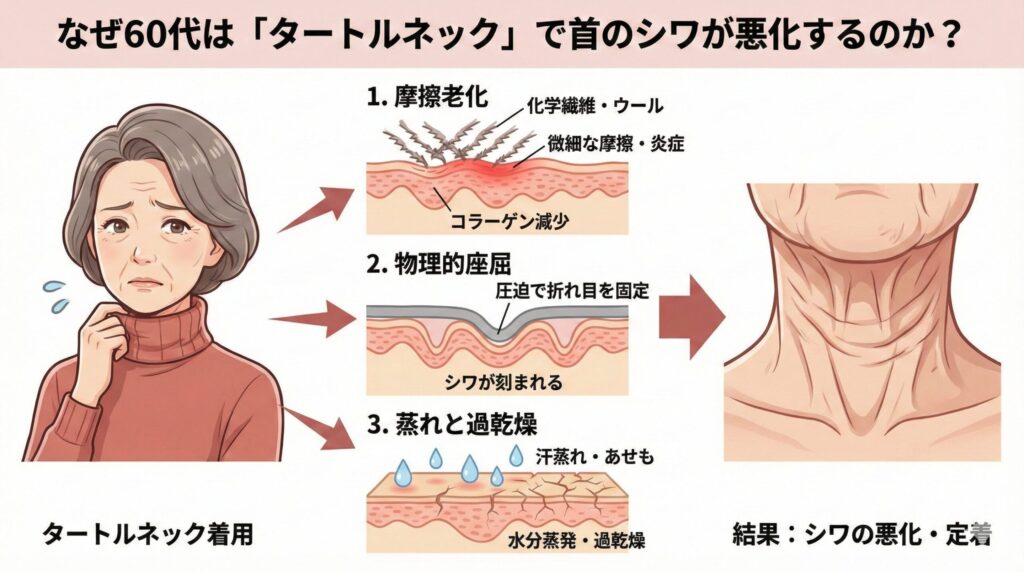 もちろん、温かいしおしゃれです。でも、「60代の首のシワ対策」という点では、残念ながら逆効果になってしまうことがあるんです。その理由は、大きく分けて3つあります。