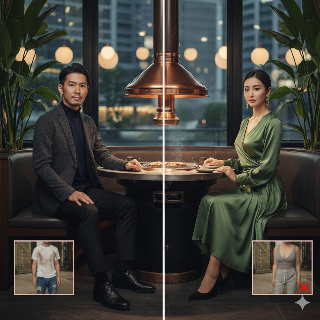 大胆な予想ですが、これからは「高級焼肉に行くための機能性ウェア」という新たなファッションジャンルが生まれるかもしれません(笑)。見た目の上品さと機能性を両立させた服を選ぶことで、心からリラックスして食事を楽しめるはずです。
