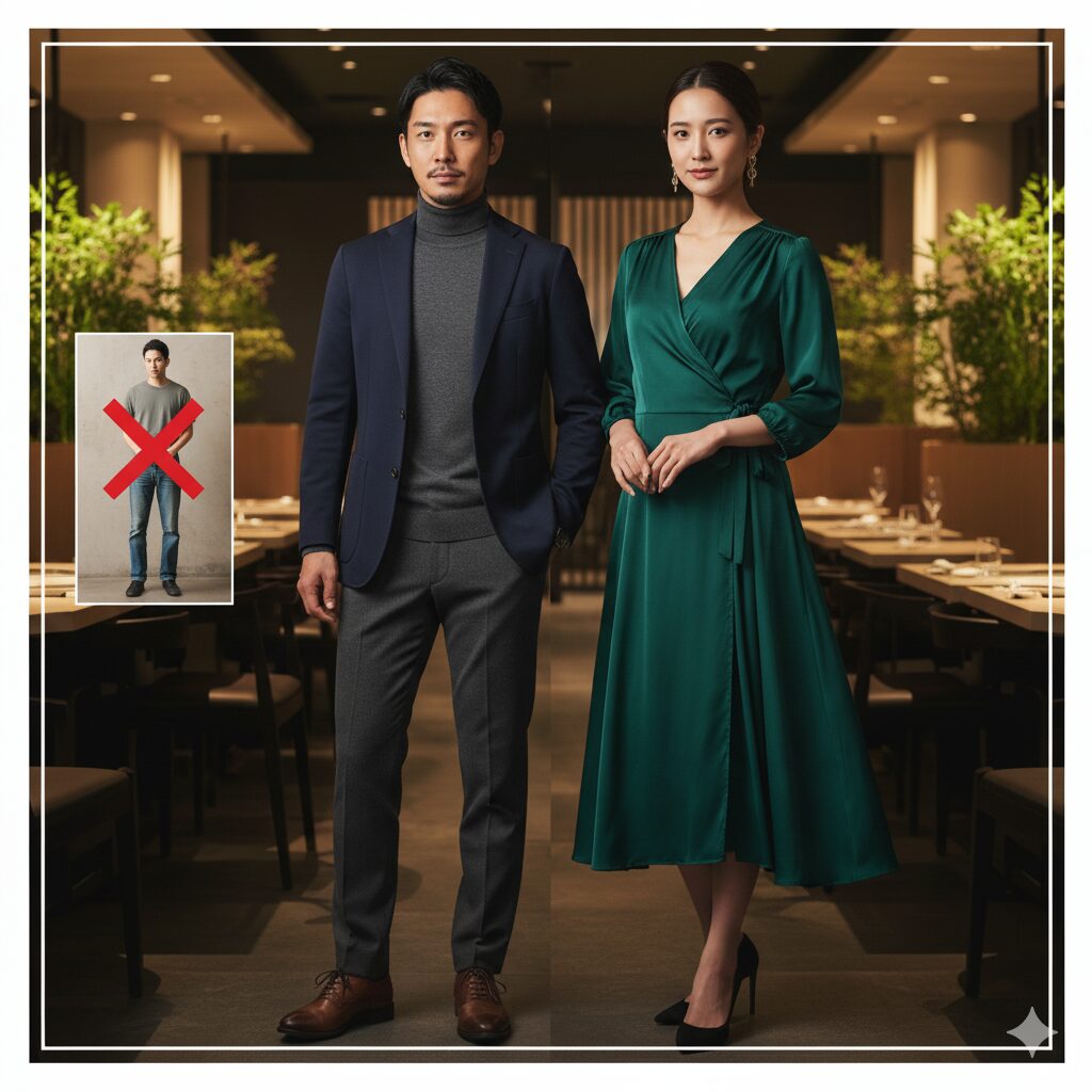 スーツはどんな場所でも一定の敬意を示すことができますから、迷ったときには非常に頼りになる選択です。ただし、あまりにビジネスライクな雰囲気を出しすぎると、デートやプライベートな食事では少し堅苦しく見えてしまうかもしれません。