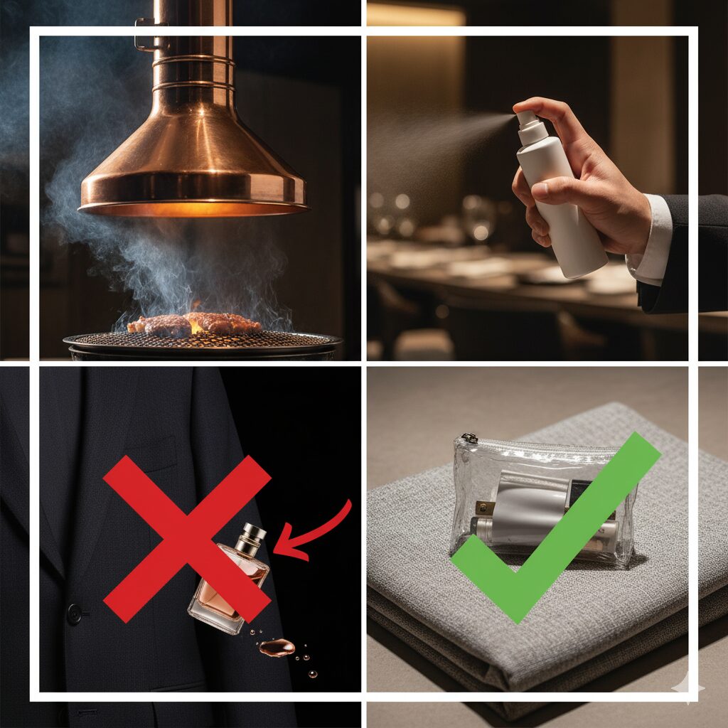 服装選びの次は、おそらく誰もが一番気にしているであろうこの問題。「せっかくオシャレしても、お店を出たら全身焼肉のニオイが…」という悲劇は避けたいですよね。ここでは、そんなあなたの悩みを一気に解決する、ニオイと油対策のマル秘テクニックをご紹介します。