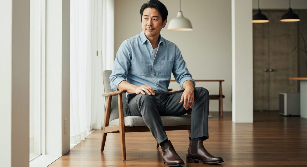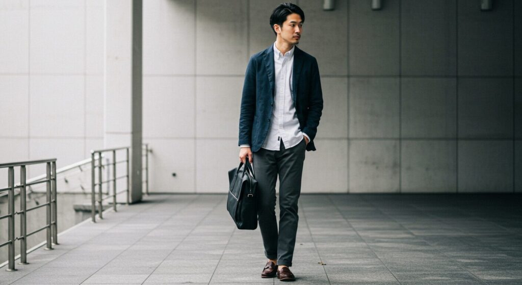 男性で最も間違いがないのが、このジャケパンスタイルです 。ビシッと決まるジャケットに、動きやすいチノパンやスラックスを合わせれば、フォーマルすぎずカジュアルすぎない、まさに「スマート」な着こなしが完成します。インナーは襟付きシャツやポロシャツが鉄板 。