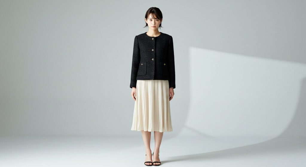 清潔感と上品さを両立させたいなら、ジャケットとスカートの組み合わせがぴったりです 。インナーにはブラウスやカットソーを合わせると、堅苦しくなりすぎず、ほどよい抜け感を演出できます。まるでできるキャリアウーマンが休日におしゃれを楽しんでいるような、洗練された大人の雰囲気を醸し出せますよ。