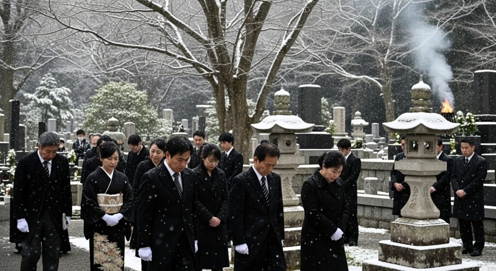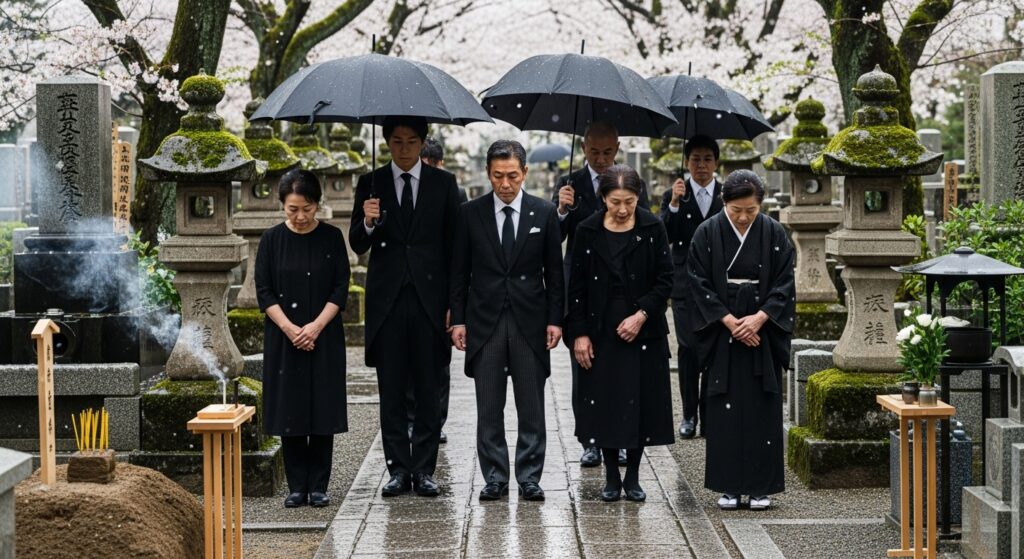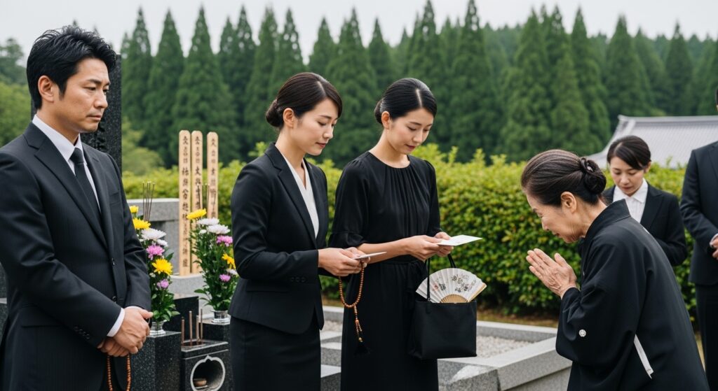 この時期の納骨では、原則として準喪服(ブラックスーツなど)が目安とされます。 - イメージ: