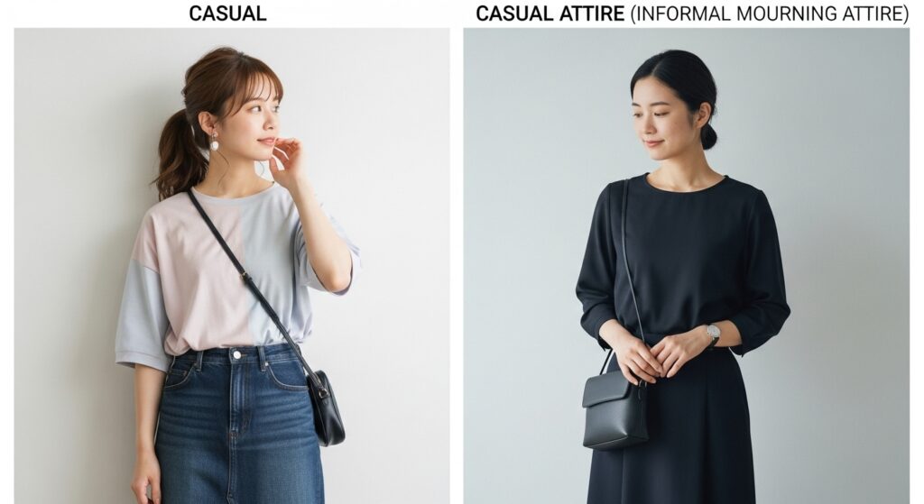 ユーザーが「カジュアル」と検索する意図の裏には、服装選びの労力や費用を削減したいという要望があります。しかし、上位コンテンツが採用している共通戦略は、その「カジュアル」という語彙を、マナー上の正式な許容範囲である「平服」(略式喪服)へ置き換え、その厳格な境界線を示すことです。