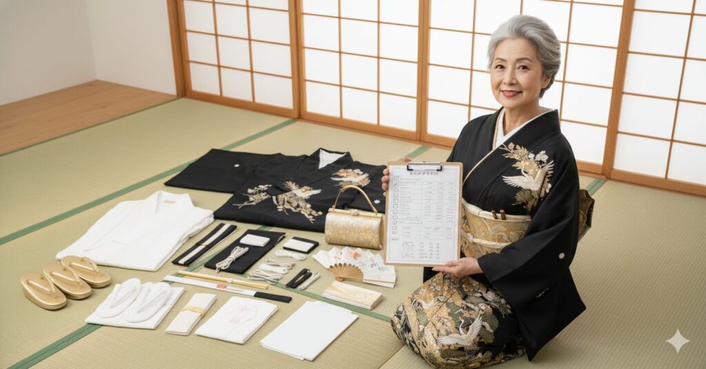 着物レンタル【wargo】の黒留袖レンタルに含まれるアイテムを、分かりやすいチェックリスト形式で徹底的に透明化しました。合計14点以上の小物が含まれることが、真の「フルセット」としてユーザーに認識される最低ラインだと私たちは考えています。