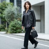 これだけで、ファンとしての熱量は保ちつつも、大人のTPOを意識した洗練されたスタイルが完成します。また、ライダースジャケットのような辛口なアイテムも、きれいめなプリーツスカートやフレアスカートと合わせれば、「まろやかに」なり、50代の装いに馴染ませることができます。