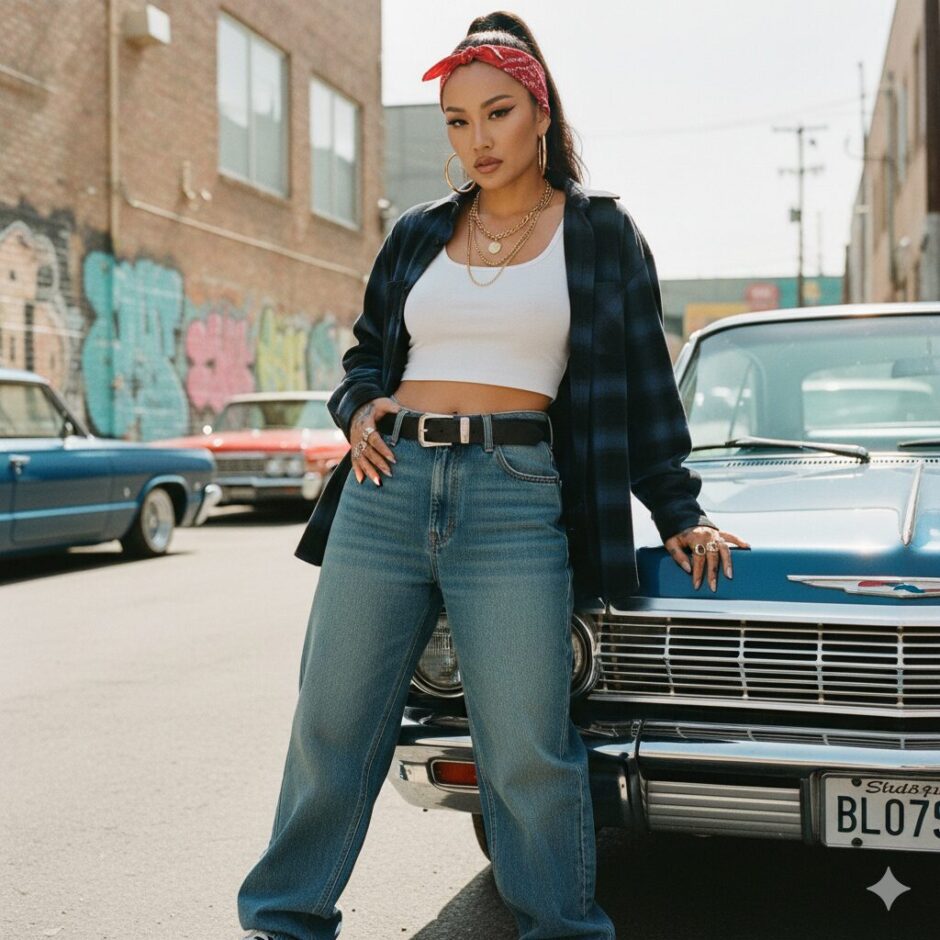 「でも、全身ダボっとさせちゃダメなの?」という疑問、よくわかります。全身をルーズなアイテムで統一するスタイルもありますが、それは上級者向け。まずは、タイトなトップスとルーズなボトムスというコントラストをつけることで、一気にローライダーファッションらしさが出ます。まるで、「きっちりしたお姉さんが、遊び心で太いパンツを穿いてみた」みたいなイメージです(笑)。