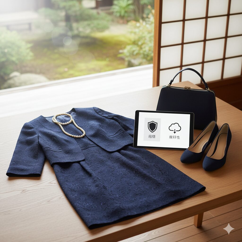💡 「露出を避ける」ことはマナーとして共通していますが、実は「派手すぎず、地味すぎず」のバランスが一番難しいです。特に全身真っ黒や濃いグレーは、喪服を連想させるリスクがあるため、「地味=正解」とは限りません 。ネイビーを選ぶ際は、後述する「素材の光沢」で華やかさをプラスする工夫が必要です。