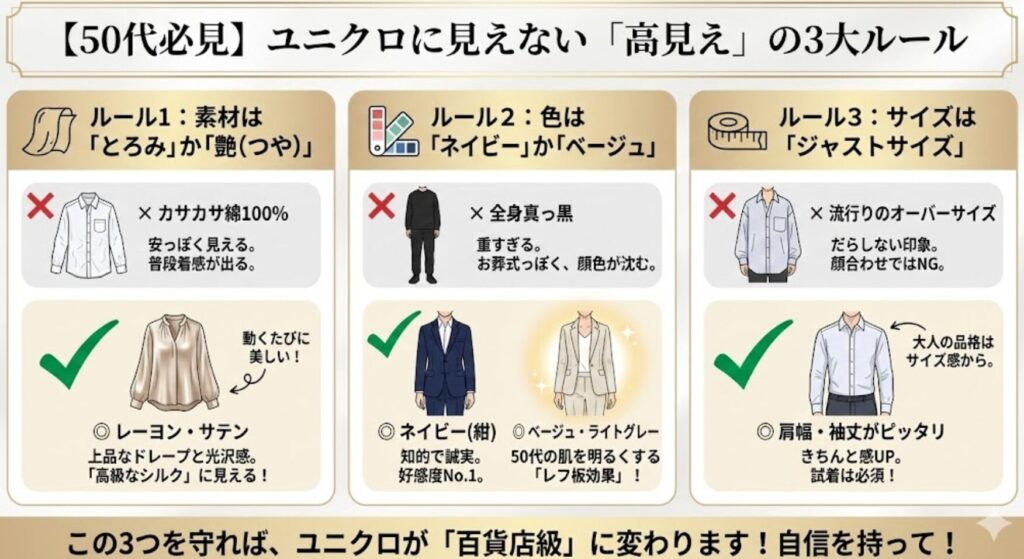では、ユニクロの店内にある何千着もの服の中から、何を選べばいいのでしょうか? 50代のお母様が選ぶべき「高見えの鉄則」は、たった3つです。